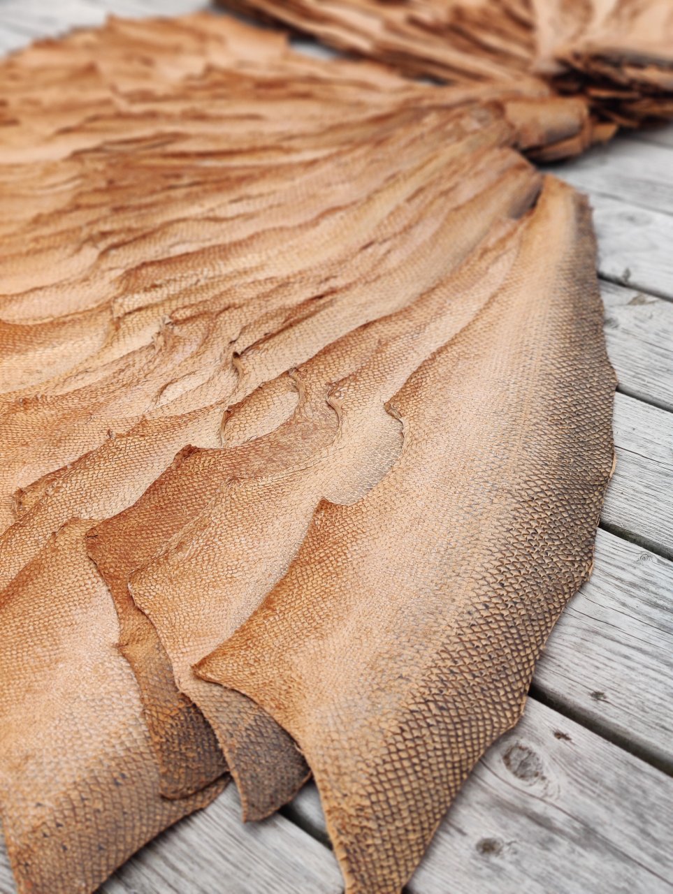 Traditionell fettgarvning av fiskskinn